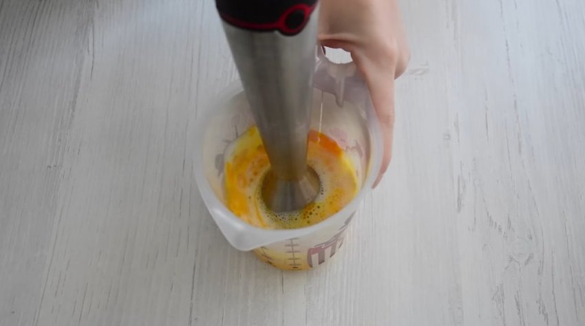 Отдельно соедините яйцо, цедру, сок лимона. Пробейте массу погружным блендером для получения однородной консистенции. При желании можно добавить несколько капель пищевого красителя, так печенье будет более ярким.