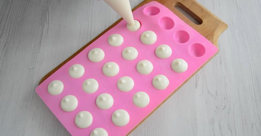 С помощью кондитерского мешка выложите начинку в силиконовую форму с небольшими ячейками, также можно использовать форму для льда. Замороженную начинку будет легко поместить в центр печенья.