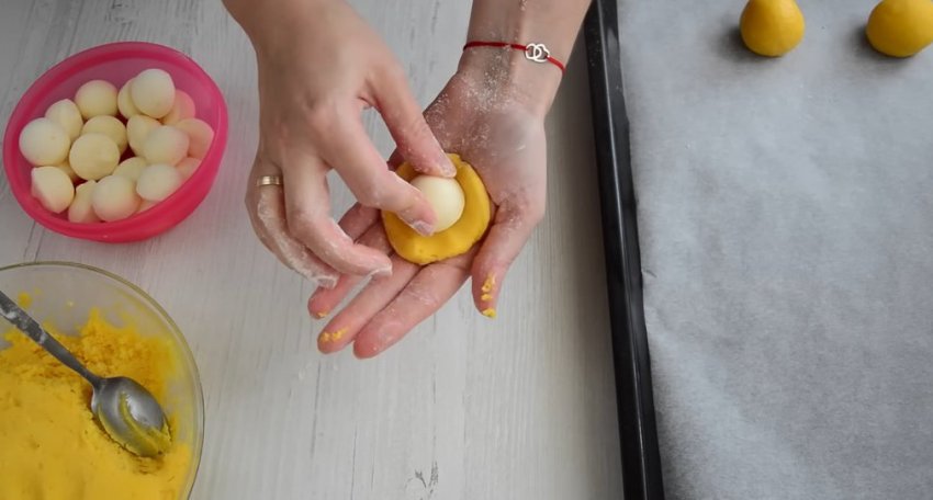 После охлаждения тесто практически не будет прилипать к рукам, и с ним будет удобно работать. Для формовки печенья чайную ложку с горкой теста превратите в лепешку и поместите в центр замороженную начинку. Сформуйте шарик.