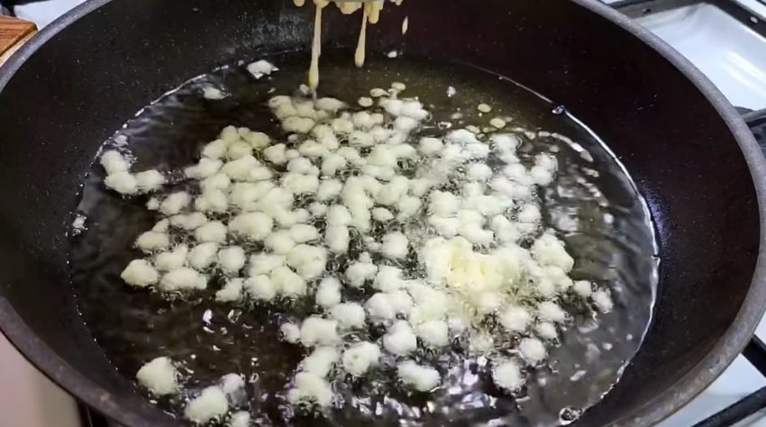 Поместите тесто в раскаленное растительное масло, предварительно налив его в шумовку.