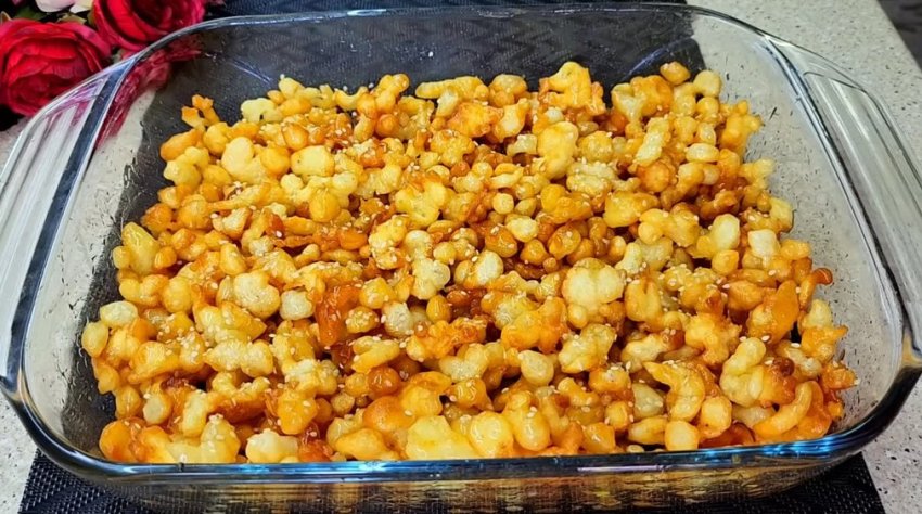 Когда хочется съесть что-то сладкое, или порадовать семью оригинальным десертом, не потратив при этом много времени на готовку, обязательно приготовьте эту сладость. Самое необычное в этом рецепте — способ приготовления, для которого необходима шумовка. С помощью шумовки получится легко получить маленькие золотистые и хрустящие кусочки теста, которые в сочетании с сахарным сиропом не оставят никого равнодушным.