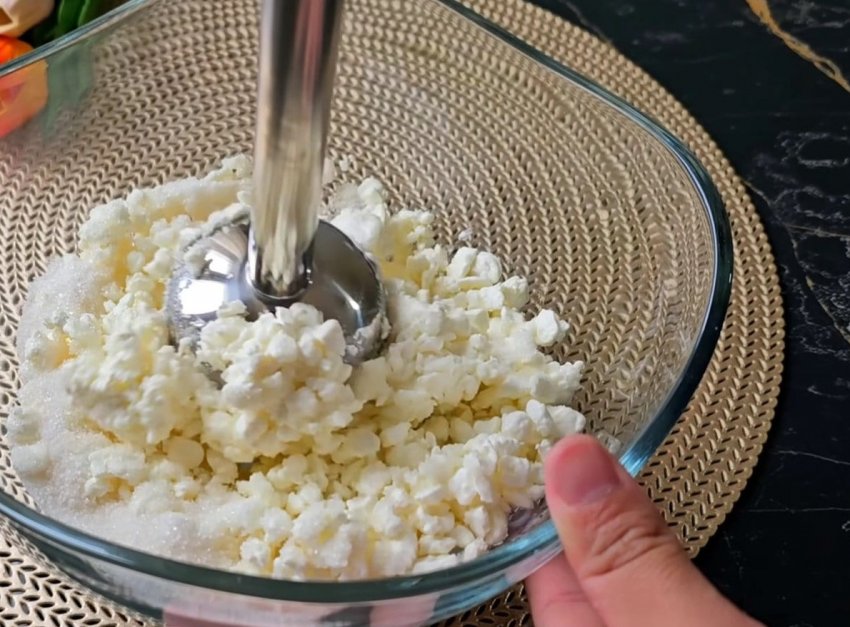 Чтобы приготовить начинку, просто перетрите творог с сахаром и ванильным сахаром с помощью погружного блендера.