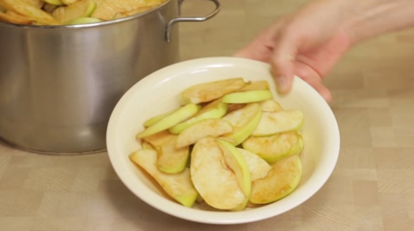 Нарежьте яблоки на дольки и выложите в кастрюлю, присыпая сахаром. На этом этапе необходимо добавить 1/3 часть от всего сахара. Накройте яблоки крышкой и оставьте на столе на сутки.
