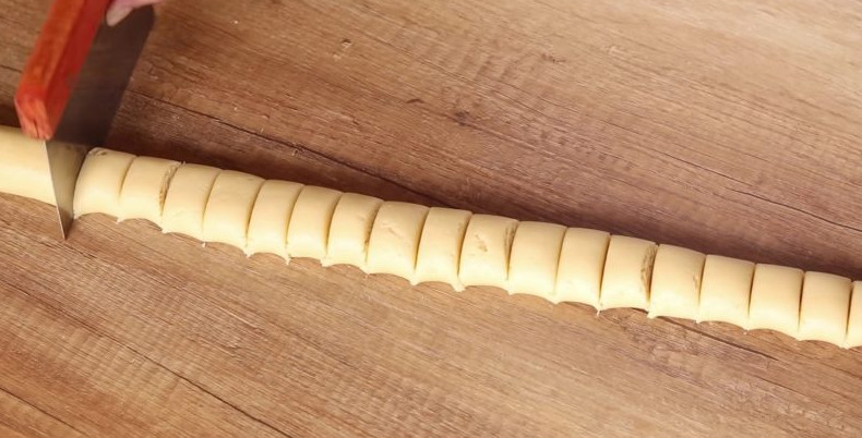 Сразу же раскатайте тесто, придав ему форму «колбаски». Разделите полученную «колбаску» на 23-25 равных частей.