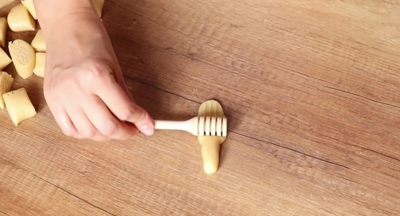 Каждому кусочку теста придайте продолговатую форму. Приготовить красивое печенье поможет ложка для меда, с помощью которой получится создать оригинальную текстуру на поверхности теста. Все, что нужно сделать — просто прокатать тесто ложкой для меда.