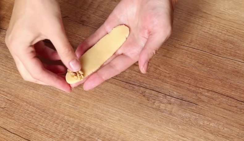 На край гладкой стороны теста выложите грецкий орех и аккуратно заверните заготовку. В качестве начинки также можно использовать курагу, чернослив, изюм, кусочек шоколада.