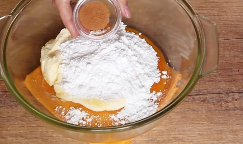 В большой миске соедините размягченное сливочное масло, соль, ванилин, сахарную пудру и желтки. Перемешайте продукты до получение массы с однородной консистенцией.