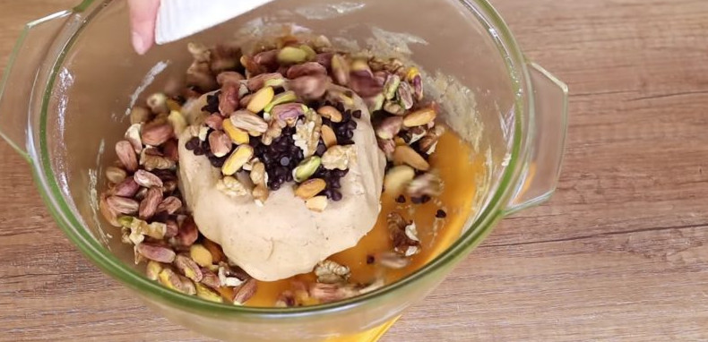 По частям введите муку, смешанную с разрыхлителем, и замесите однородное мягкое тесто. Добавьте к тесту шоколад и орехи и тщательно перемешайте ингредиенты.