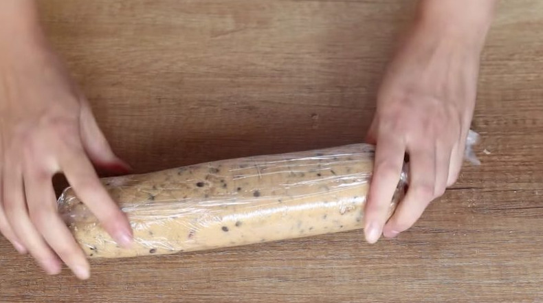 С помощью пищевой пленки сформуйте из теста плотную «колбаску». Поместите тесто в морозильную камеру на 40-45 минут.