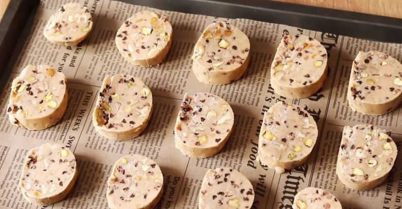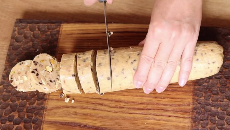 Замерзшее тесто разрежьте на порционные печенья толщиной примерно по 1,5 см.
