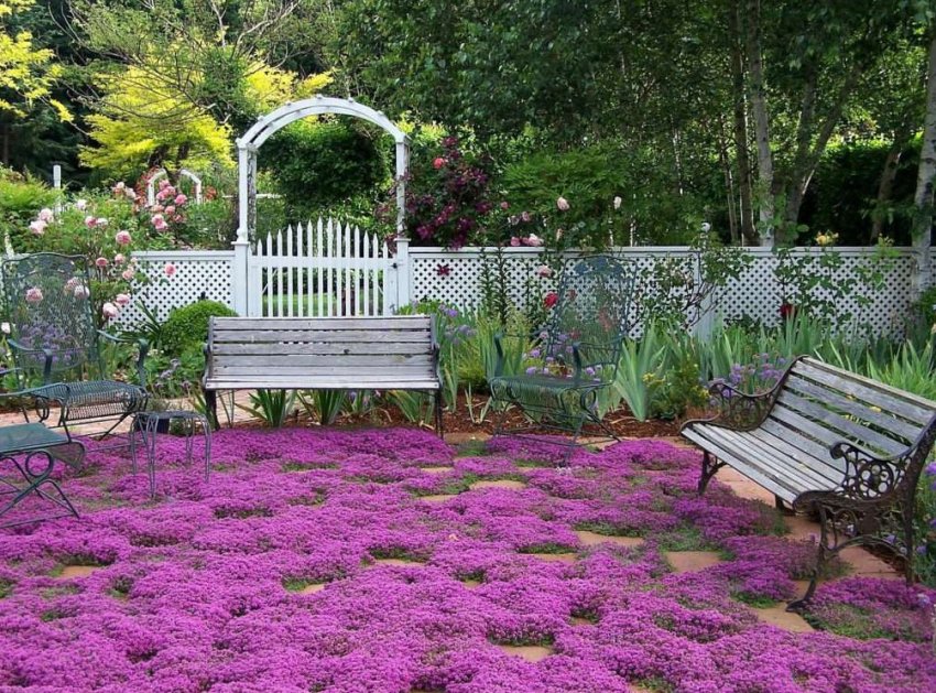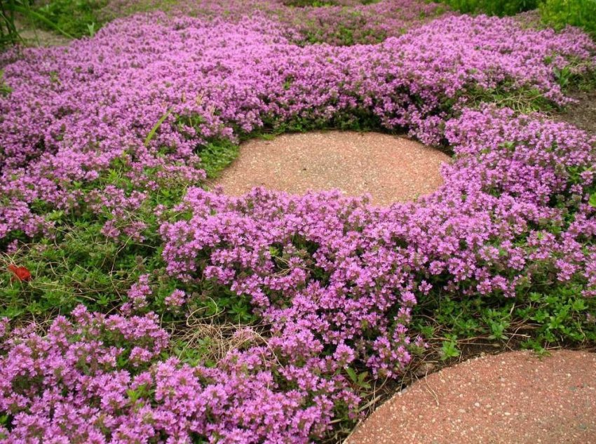 В ландшафтном дизайне тимьян тоже имеет популярность. Ароматные синие или лиловые кустики хорошо вписываются в цветочные композиции на солнечных участках. А отдельно посаженные растения тимьяна придадут гармоничный вид любой территории.