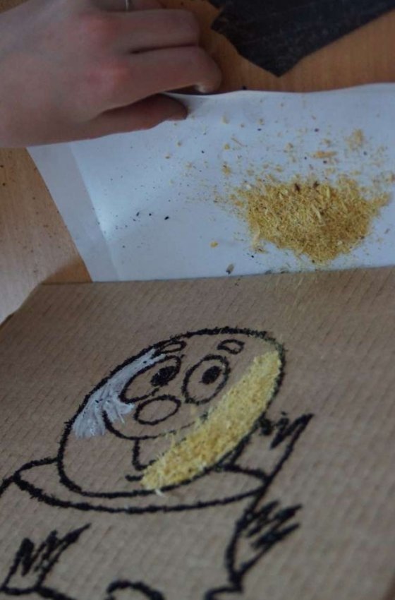 Измельченная древесина хорошо окрашивается раствором гуаши. После просушивания из неё можно делать аппликации, приклеивая на картон получится картина. На полу или дорожке – выйдет мягкий декоративный коврик.