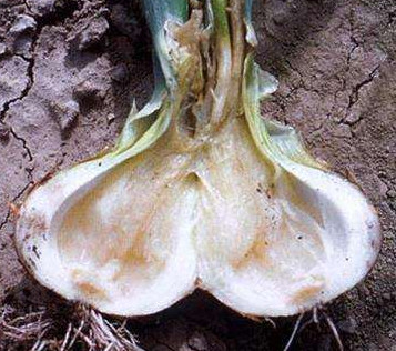 Бактериальная гниль. Вредитель возникает еще на первых порах выращивания лука, когда лук находится на семенниках. Причиной появления болезни становятся бактерии, которые проникают с почвы. Перышки молодого лука сразу приобретают желтый оттенок по всей длине, увядают и загнивают. Интересно, что пораженную луковицу не так просто определить, поскольку внешне она ничем себя не выдает: окрас остается таким же, форма тоже. Но только при разрезе можно увидеть, что под плотным внешним шаром кроется загнивающие чешуйки. Полностью сгнить луковица сможет только через пару месяцев, а пока ее садят в открытый грунт, без мысли о том, что она поражена.