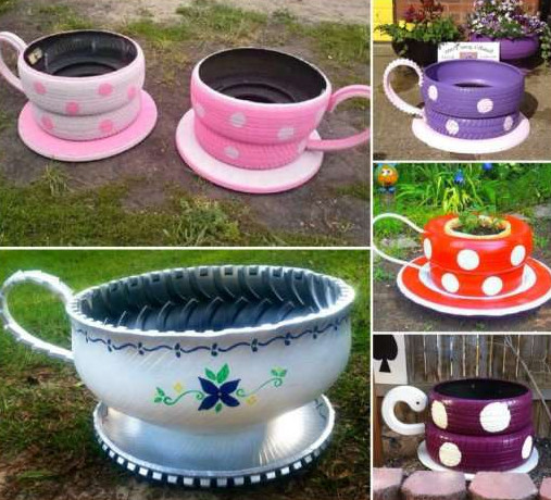 Фантазеры придумали даже две чашки, которые выполнены из шин и стоят на участке. Основную чашу вырезают, а ручки можно металлической ленты.