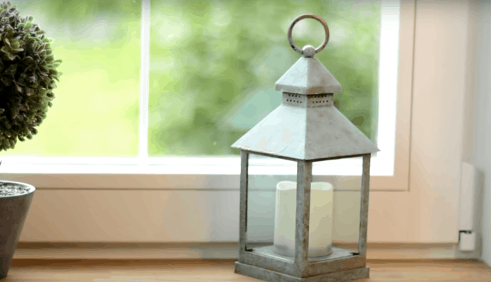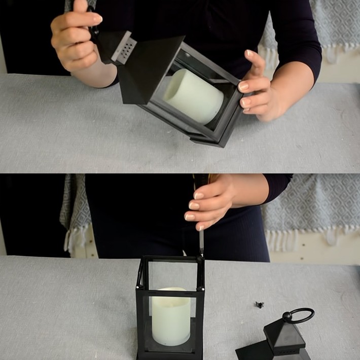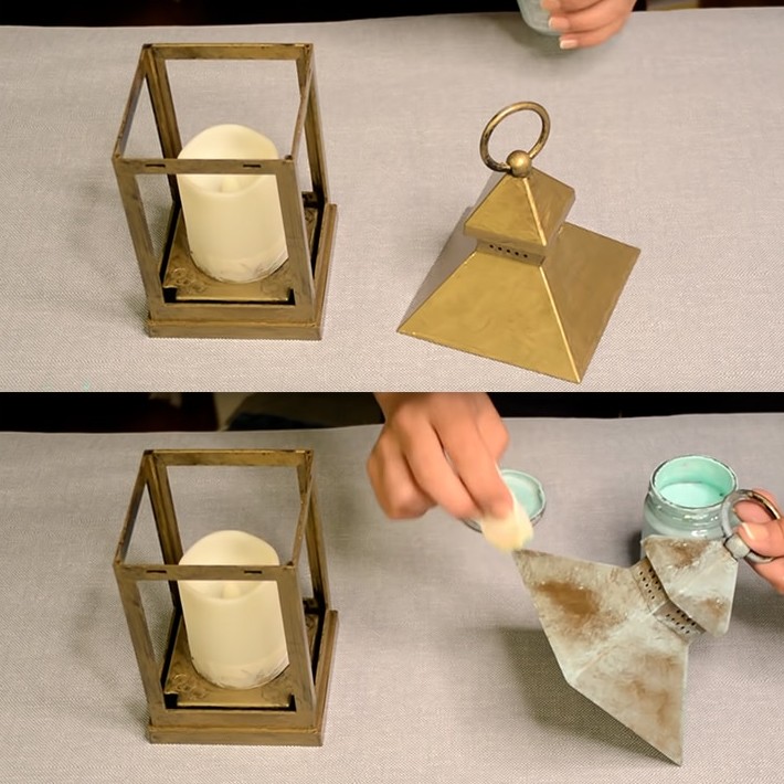 Покрасьте крышку фонаря снаружи и изнутри в выбранный цвет. Если краска акриловая, потребуется грунтовка. Если на базе растворителя, можно красить без подготовки. Покрасьте основу, предварительно обернув свечку-диод малярным скотчем. После того как краска высохла, возьмите светлый оттенок и нанесите его с помощью немного распотрошенного макияжного спонжа. Это будет патина.