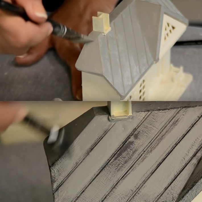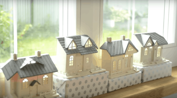 Ручки обрежьте канцелярским ножом и прикрутите, сделав эффект печных труб. Покрасьте домики. Крыши можно сделать контрастного цвета. Если пройтись по ним почти сухой кистью, получится винтажный эффект.