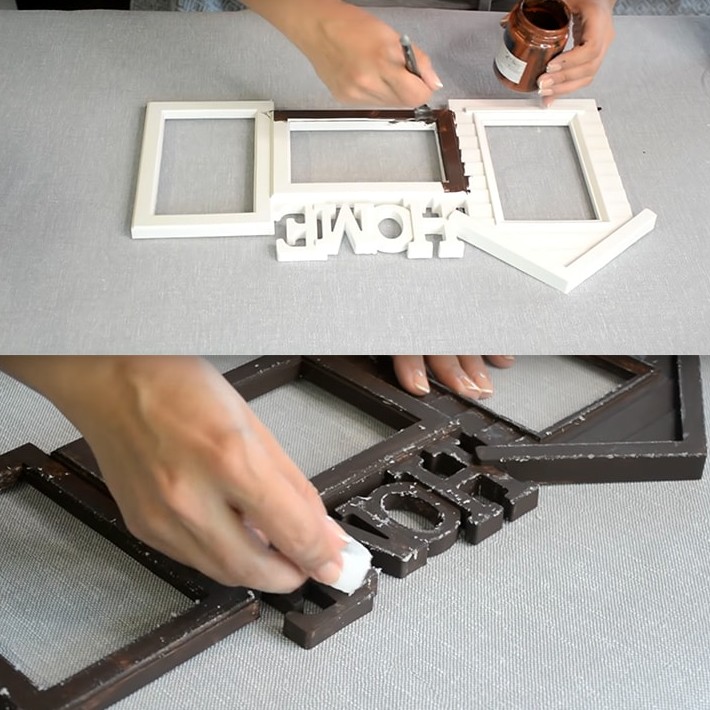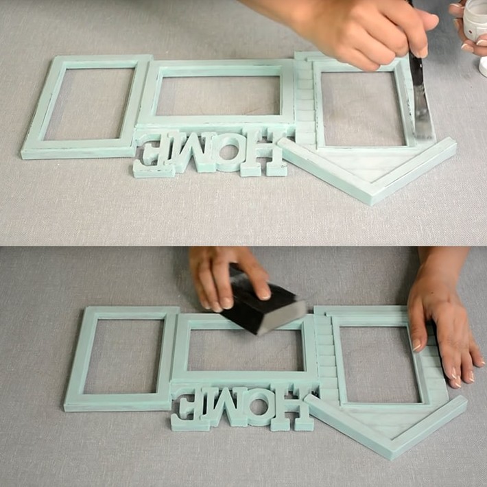 С помощью абразивной губки или мелкой шкурки пройдитесь по углам и краям, которые были натерты свечкой. Покройте рамку прозрачным матовым лаком.