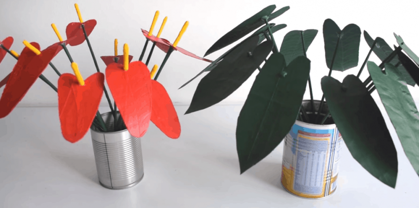 Сделать антуриум, внешне напоминающий красные каллы не намного сложнее. К заготовкам листьев и цветов здесь добавятся обернутые тканью ушные палочки (пестики) и газетные трубочки (стебли).