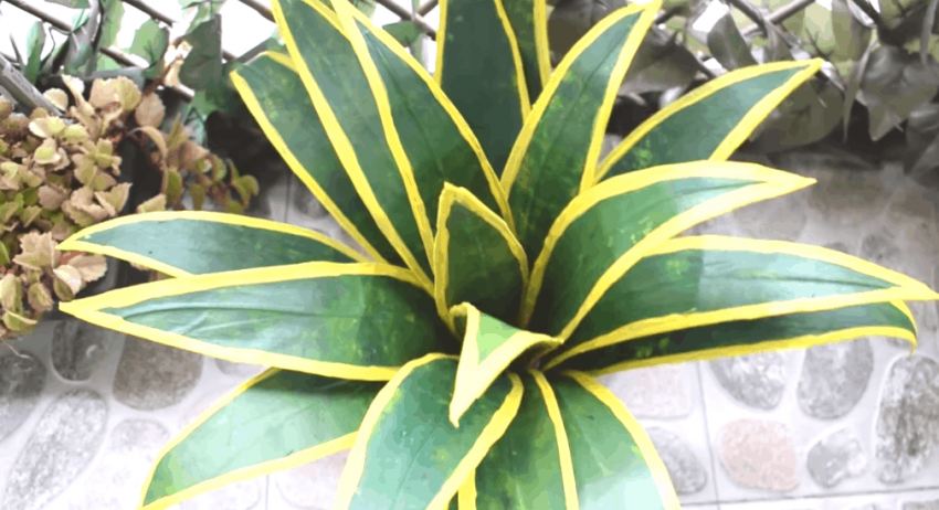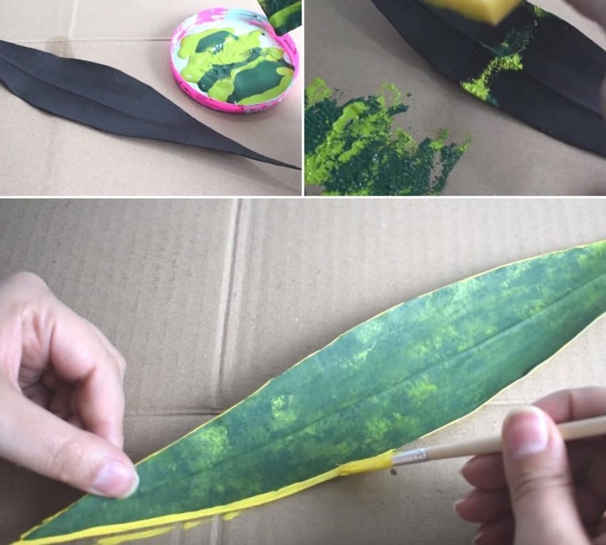 Сансевьера шикарно выглядит благодаря необычному окрасу листьев. Для ее создания придется подобрать зеленую краску нескольких оттенков.