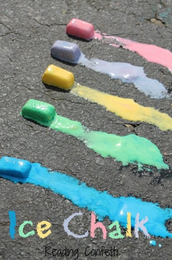 Дети обожают рисовать мелом на асфальте. Предложите им создать шедевр с помощью ледяного мела. Рецепт его приготовления очень прост: смешайте 70 мл воды и 15 мл смываемой темперной краски. Добавьте к полученной массе по 70 гр. крахмала и пищевой соды, хорошо перемешайте и перелейте раствор в формочки для льда. Замораживайте, пока мел не станет твердым. Вся прелесть использования ледяного мела состоит в том, в жару он будет таять на асфальте, создавая необычные узоры, которые очень понравятся детям.