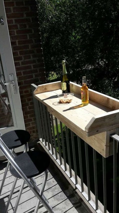 Всего несколько досок — и функциональный съемный столик в вашем распоряжении. С таким приспособлением получить дозу релакса можно даже на маленьком балконе.