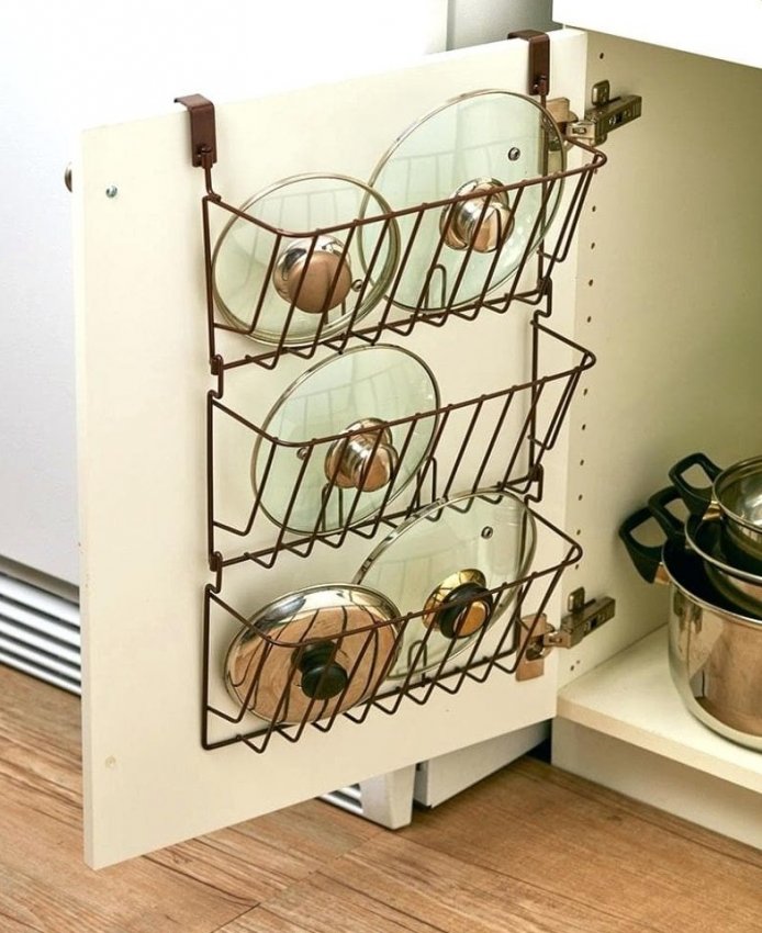 Используя внутренние части створок кухонной мебели, стены сверлить уже не придется. Экономия пространства тоже на лицо.