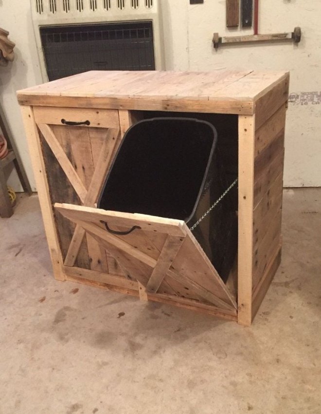 В такой тумбе легко скрыть не только мусорное ведро, но и тысячу необходимых в хозяйстве мелочей.