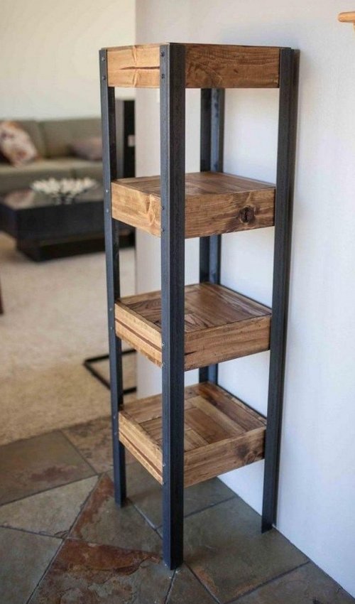 Интересная этажерка получилась из нескольких уголков, дополненных обрезками доски. Прочная, внешне напоминающая колонну она может иметь разное наполнение.