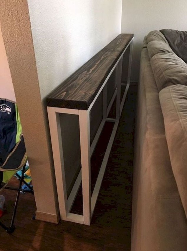 Зазор между диваном и стеной легко превратить в дополнительную систему хранения.