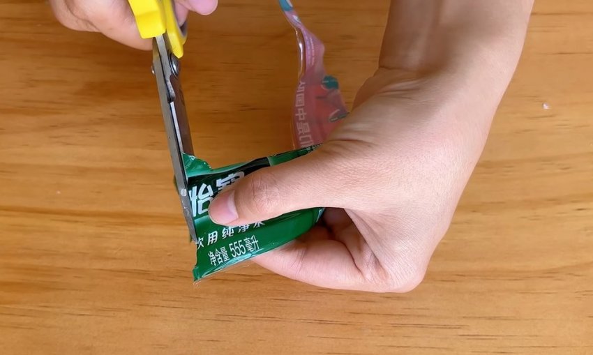 Отрежьте небольшой кусочек этикетки от пластиковой бутылки.