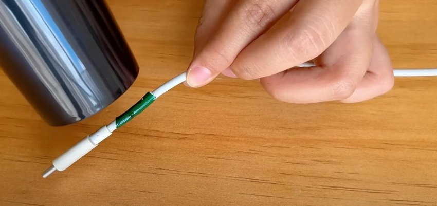 Починить можно даже кабель, в котором оголены провода. Для ремонта потребуется пружина от шариковой ручки, которую необходимо намотать на поврежденный участок.