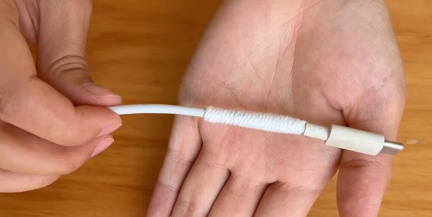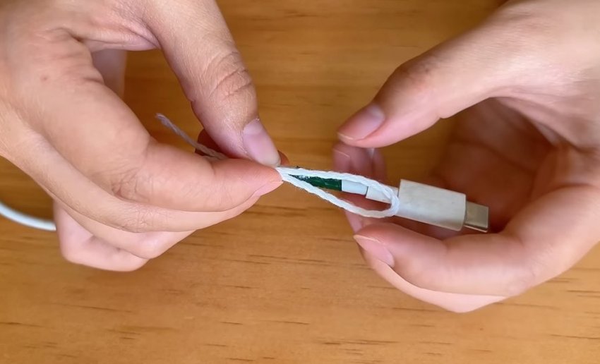 Для дополнительной защиты обмотайте поврежденный участок толстой ниткой. Для этого сложите нить петелькой у основания кабеля.