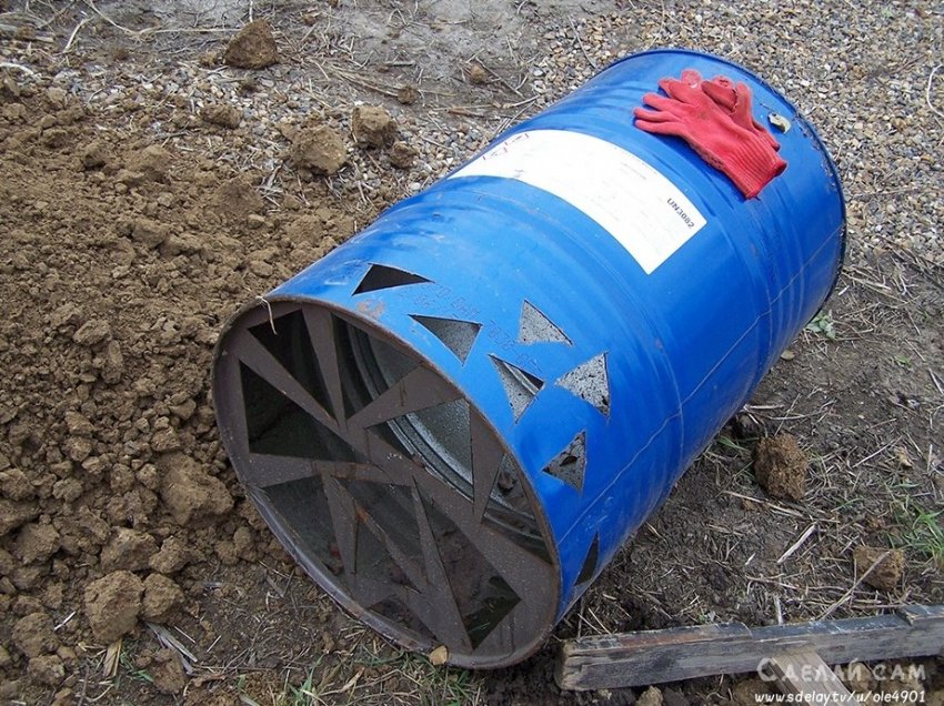 Продырявливаем бочку. Используем для этого болгарку. Чем больше места для прохода, тем лучше.