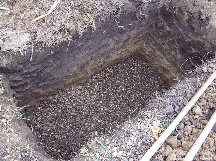 На дно ямы высыпаем наполнитель (щебень/битый кирпич/ломаный шифер и т.д.). Важно, что бы примерно 30 см было загружено пористой поверхностью, с которой будет уходить влага в почву.