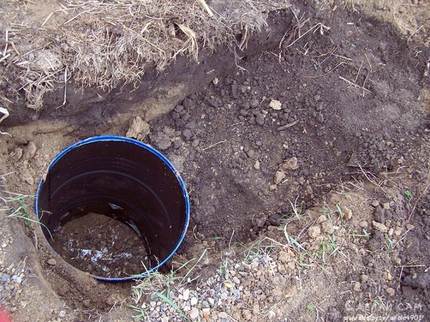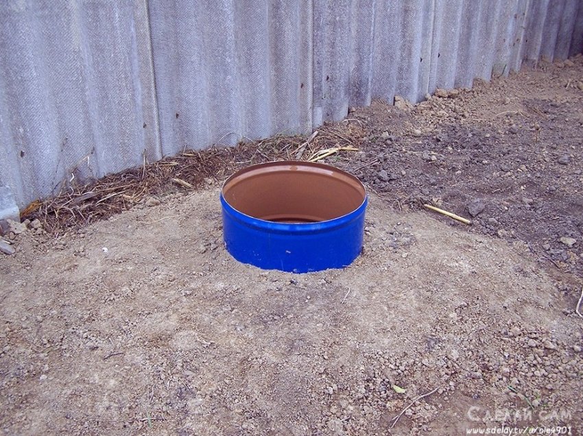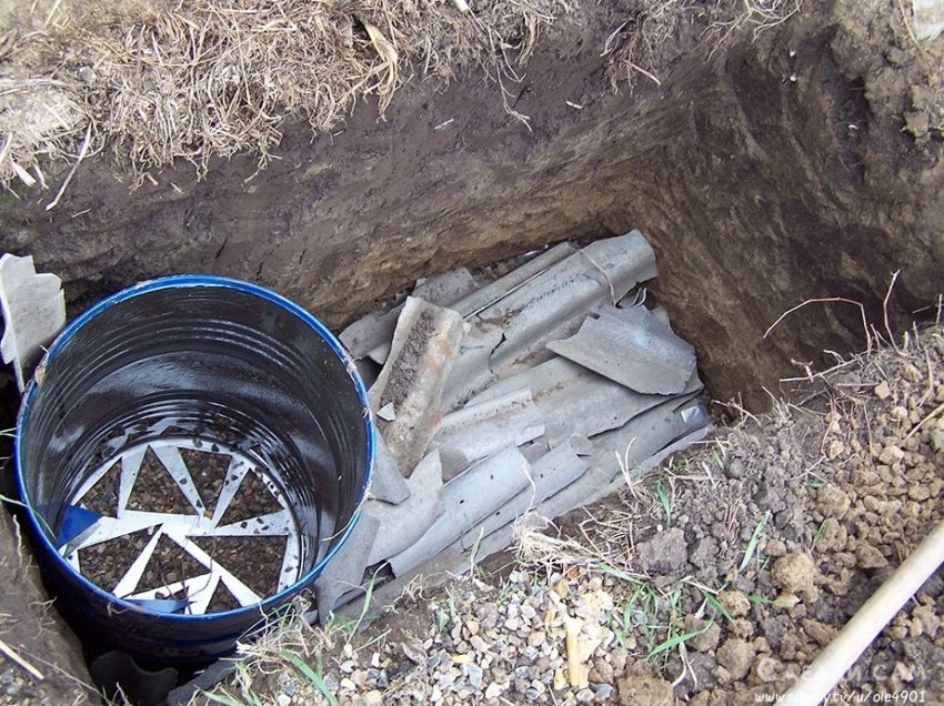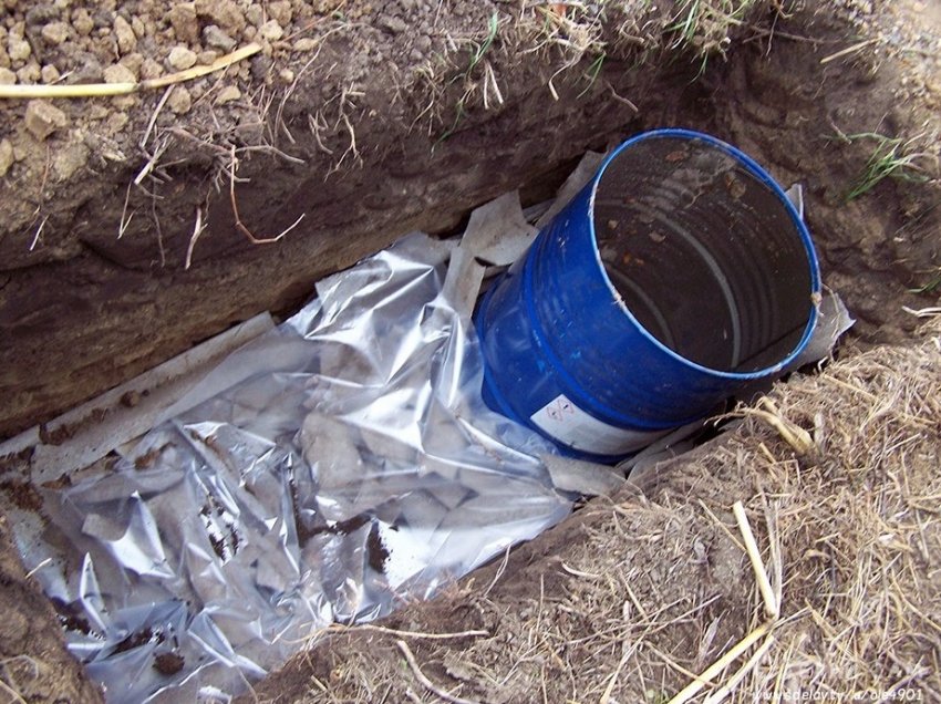 Устанавливаем в нашу яму бочку. Засыпаем всевозможный хламом вокруг.