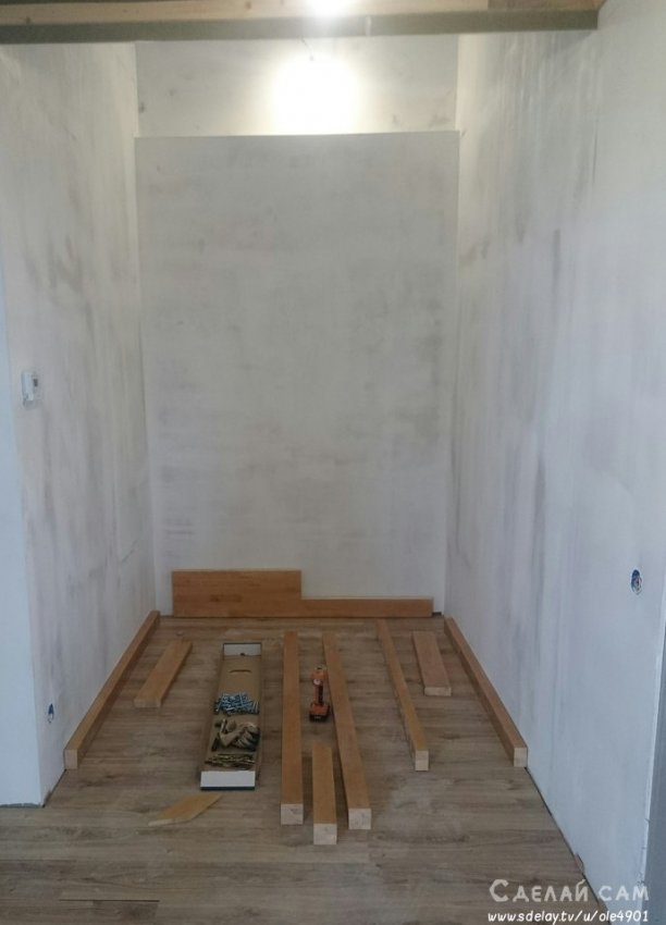 К стене также крепим одну сторону лестничной направляющей с прикрученной к ней в форме "пилы" доской. Левая направляющая крепится непосредственно к средней ноге, и к полу.