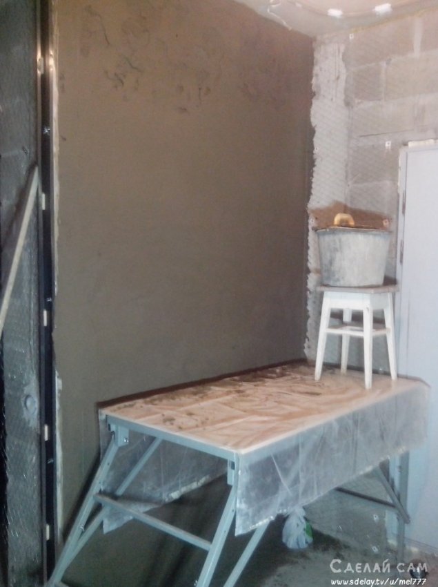 Для штукатурки стен и отделки потолка нужна какая-то поверхность, на которой удобно работать на высоте. Чего-то я со стремянкой уже напрыгался вдоволь. Еще пробовал использовать нижнюю часть от туры. Но она очень громоздкая и катать ее по помещению не эффективно.