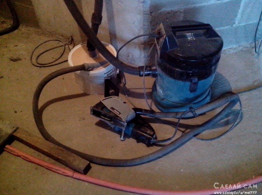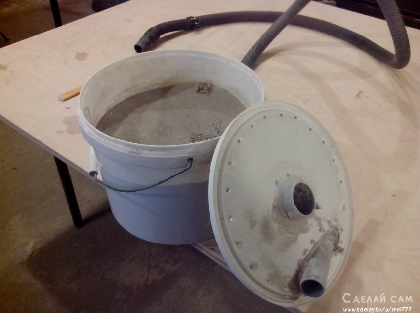 Вот придумал такое решение. Для работ по бетону - в самый раз. Да и, как оказалось, для работы деревом тоже удобней вытряхивать стружку из этого ведерка, чем постоянно чистить пыльные мешки пылесоса. Хотя и планирую в дальнейшем сделать для мастерской циклон большого объема.