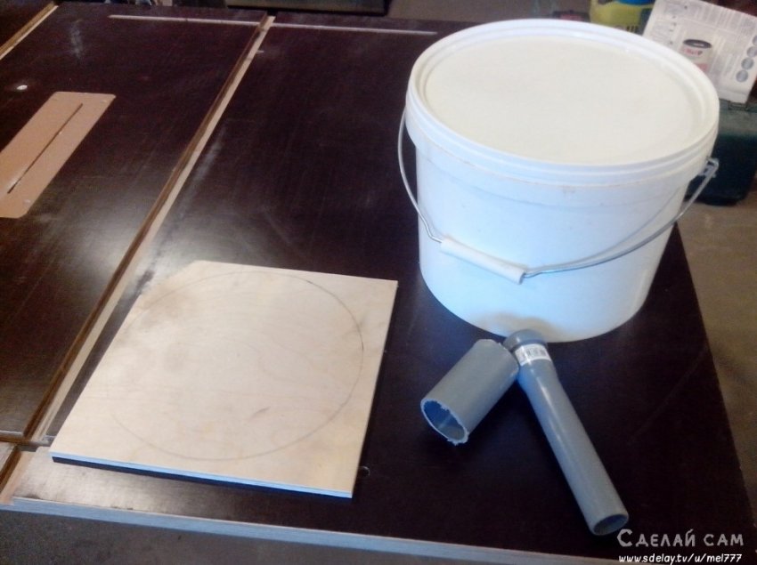 Для реализации мне понадобились: десятилитровая банка из под клея (пойдет и из-под краски - они тоже плотные), кусок фанеры, для укрепления крышки, обрезок сантехтрубы 50 мм на центральный патрубок и тонкий сантех фитинг для входного тонкого шланга.