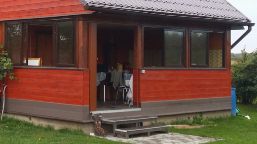 Наверное у многих есть проблема - по низу домов/строений облезает краска. У нас по крайней мере именно так. Что краска, что "Белинка" - результат один. Пару сезонов и от снега и дождей покрытие начинает облезать. Поэтому на террасе бани решил поэкспериментировать и первые два ряда обшивки сделал из композитной доски, вместо стандартной вагонки. Результатом остался доволен. И симпатично получилось и две зимы уже перенесено без проблем). К стене крепил доски саморезами на сквозь. Сначала высверливал дырки, потом уже саморезы вставлял, иначе ломает доску.